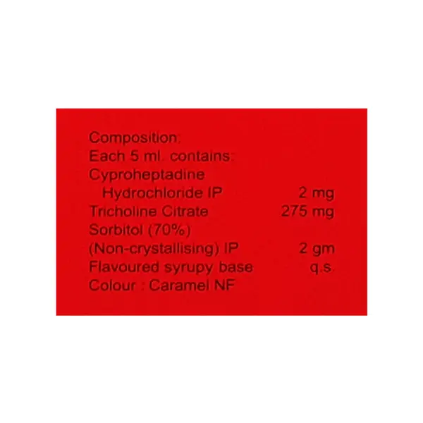 Cyproheptadine 2mg/5ml+Tricholine Citrate 275mg/5ml+Sorbitol 2gm/5ml