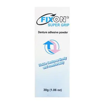Fixon Super Grip Powder contains Gantrez MS, Sodium CMC (Carboxymethylcellulose) as active ingredients. The powder is used for fixing the denture to make it comfortable in the mouth.