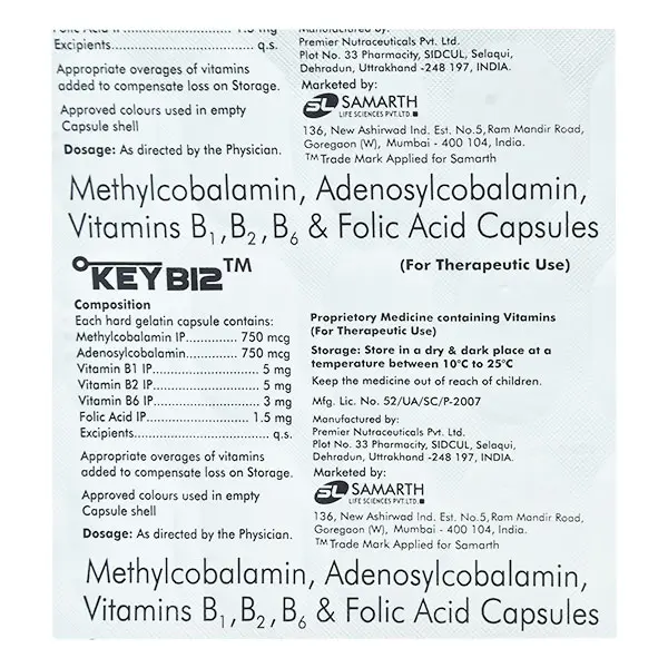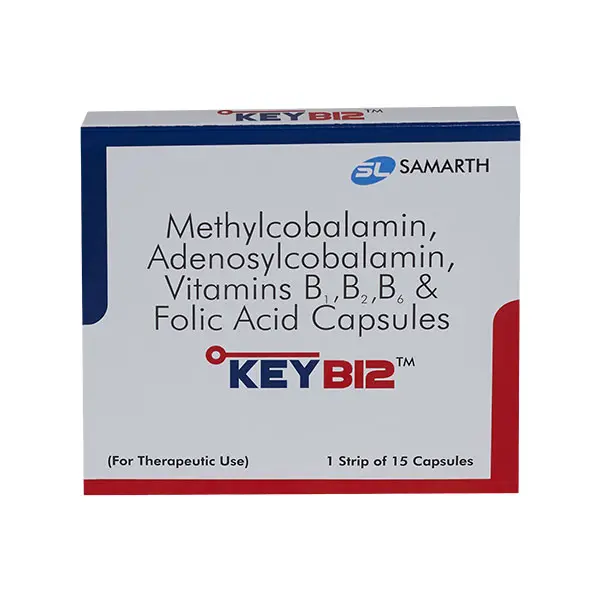 Key B12 Capsule is used to improve healthy red blood cells, and helps in energy production as well as in conditions like tiredness, depression and chronic fatigue syndrome. It is used to help growth and good health. It is used to stop and deal with low vitamin B6. It is used to avoid side effects from isoniazid. It is used to manage isoniazid or cycloserine overdose.